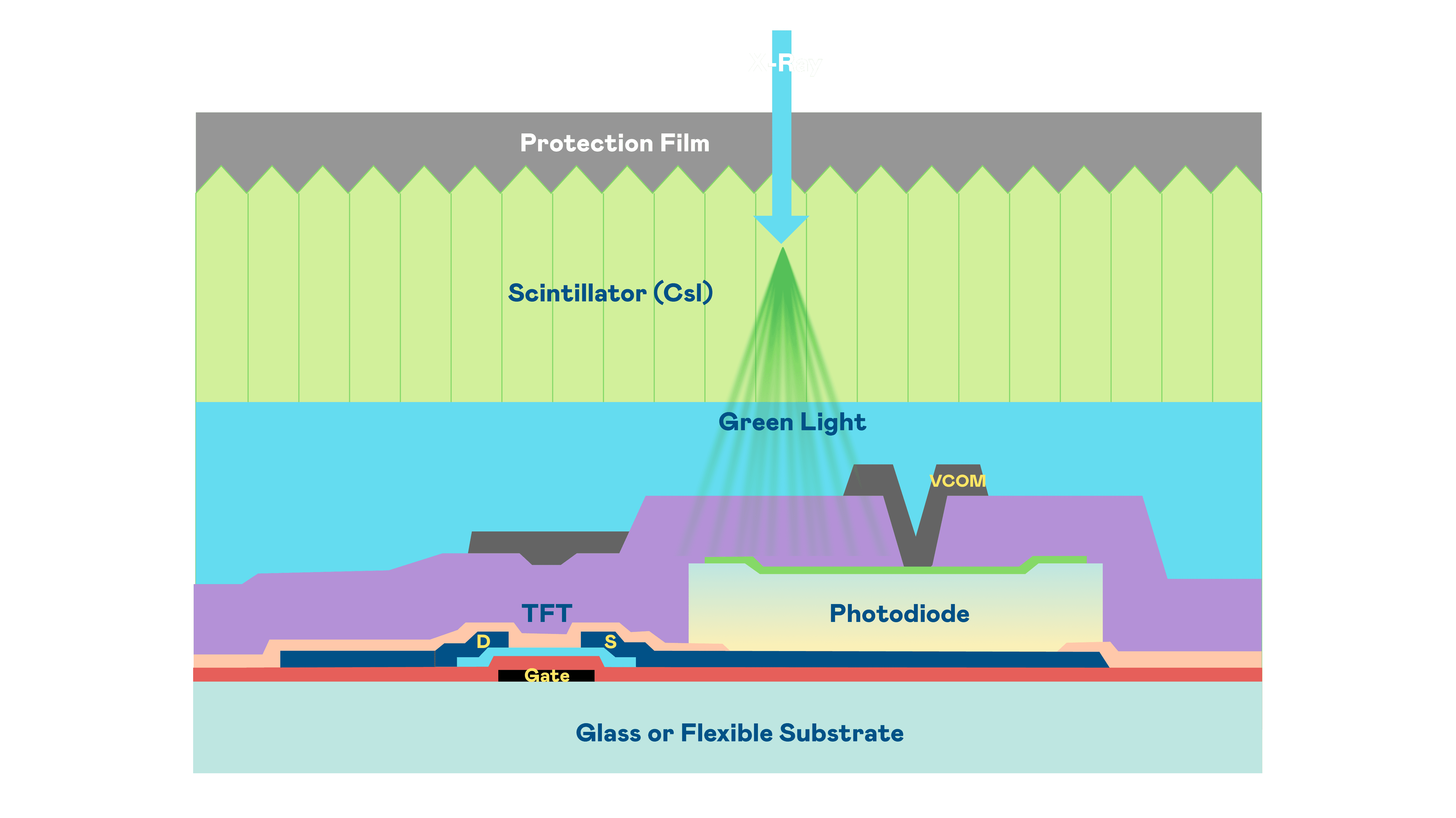 尊时凯龙的X光影像感测阵列使用薄膜电晶体 (TFT) 作为每个像素的读取开关,,搭配光电二极体(Photodiode)的光电转换元件,,,,用以感测X光影像讯号。。。